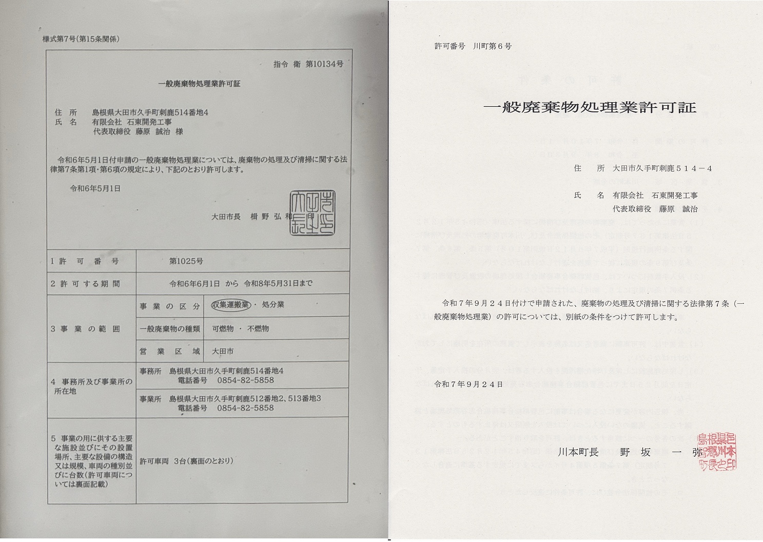 解体工事業許可、産業廃棄物収集運搬業(積替無し)許可